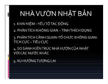 1. KHÁI NIỆM – YẾU TỐ TÁC ĐỘNG 2. PHÂN TÍCH KHÔNG GIAN – TÍNH THÍCH DỤNG 3. PHÂN TÍCH CẢNH QUAN-TỔ CHỨC KHÔNG GIANTÍCH CỰC – TIÊU CỰC 4. SO SÁNH KIẾN TRÚC NHÀ VƯỜN CỦA NHẬT VỚI CÁC...