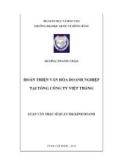 TÓM TẮT Đề tài “ Hoàn thiện văn hóa doanh nghiệp tại Tổng Công Ty Việt Thắng” đƣợc tiến hành nghiên cứu từ tháng 06 năm 2015 đến tháng 12 năm 2015. Mục tiêu của đề tài là góp phần...